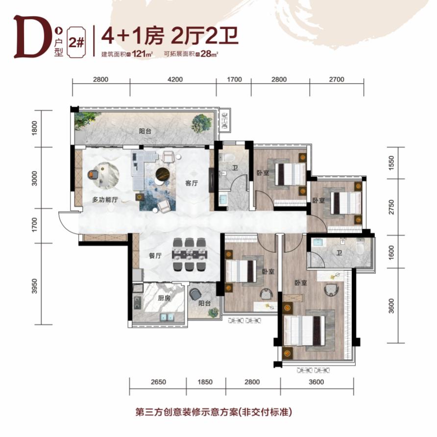 4房设计,室内承重墙较少,可以根据家庭结构,做成两房、三房、四房,实现三代同堂,可10年不用换房。