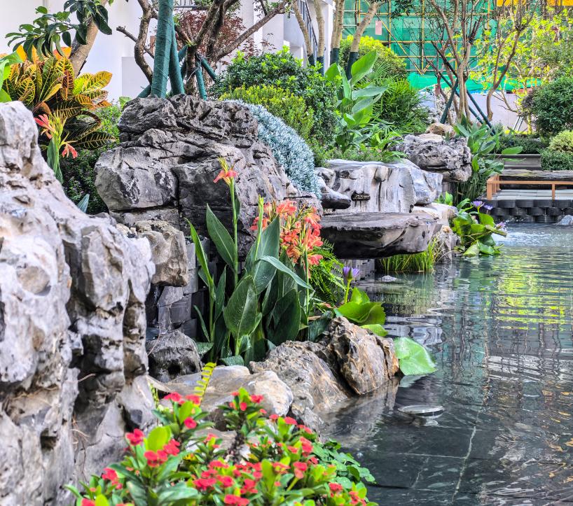 严格按照「瘦、皱、漏、透」的标准严选形态各异的太湖石,呈现泉水层层跌落,水声清越的意境。
