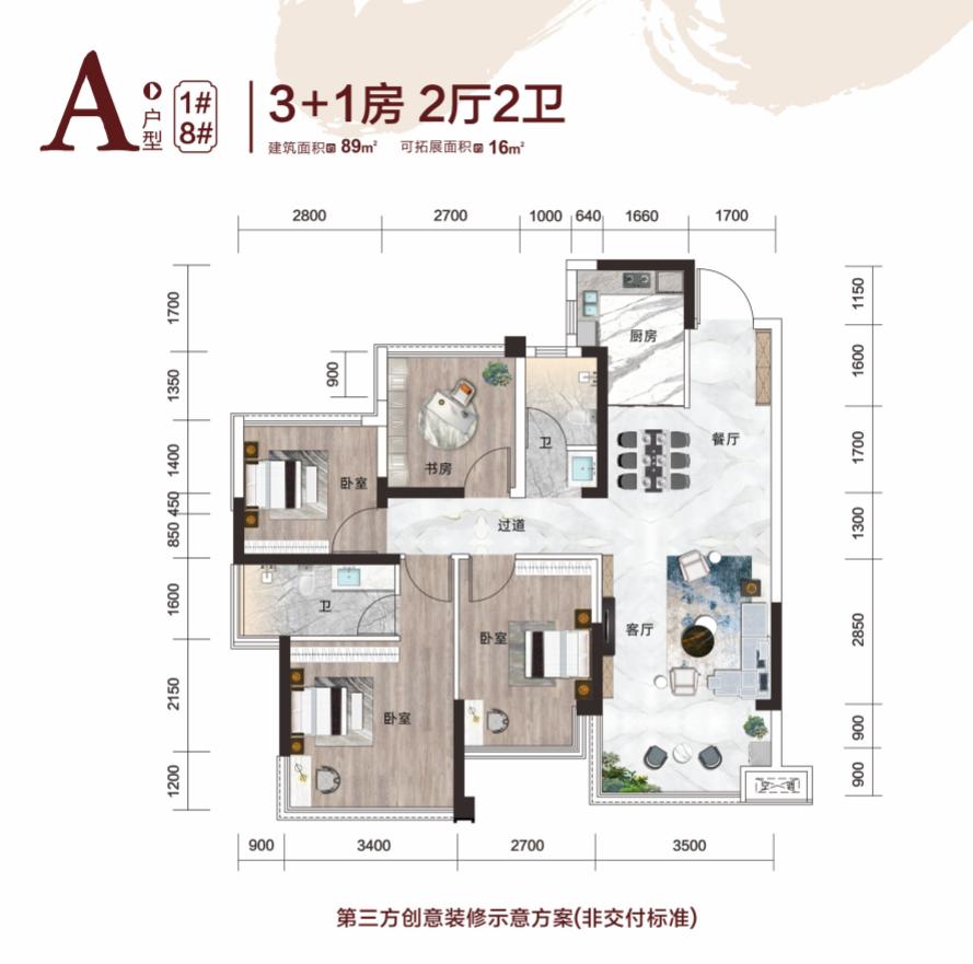 咱们结合户型图具体来看。先看89㎡的3+1房。