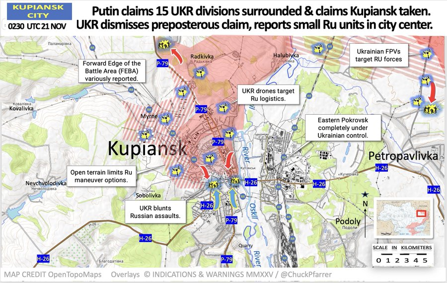 自11月初以来,乌克兰在该城市外围地区已将俄罗斯渗透者击退超过1000米。此外,11月20日至21日,乌克兰的无人机和炮击切断了俄罗斯在库平斯克北部的补给线,孤立了敌方的小规模集结点。