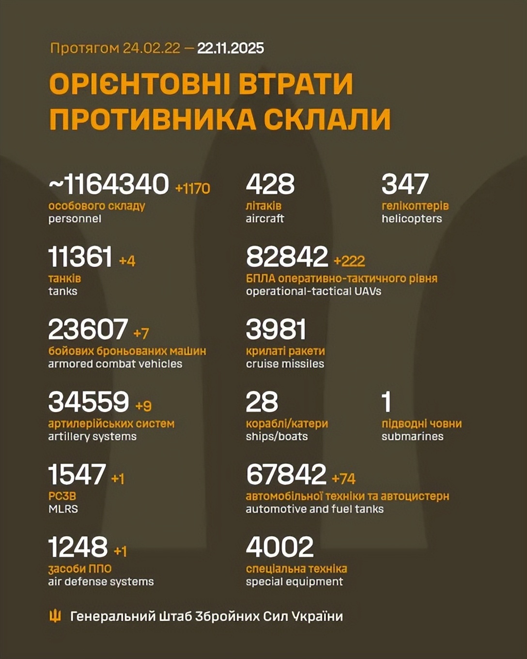 乌总参公布的昨日战果,歼敌(毙+伤)1170人。