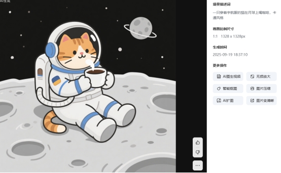 比如如输入“一只穿着宇航服的猫在月球上喝咖啡,卡通风格”那么AI就会根据你的需求生成一副这样的图片,大大加快了构思的速度和效率。