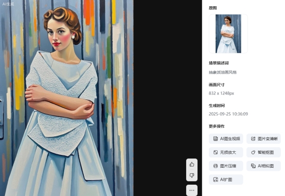 万能改图(即图生图):除了以上所说的从无到有地自行绘制之外,易可图还有万能改图功能,顾名思义就是可以通过上传现有的图片来进行相应的二次加工和编辑。输入任意改图需求,AI便会一键帮你实现,比如消除物体,就可以输入“把后面的这个人去除”,比如风格转换,就可以输入“把着张照片转成抽象油画风格”反正基本上你能想到的需求都可以通过它来实现。