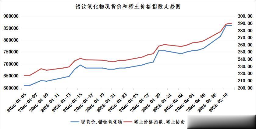 2026年开年以来,稀土核心品种走出持续强势上涨行情。1月5日镨钕氧化物现货价为610000元/吨、稀土协会价格指数217.33点,其间虽有小幅震荡整理,但整体上行斜率陡峭,进入2月后加速拉升,截至2月12日,镨钕氧化物现货价已升至860000元/吨,稀土价格指数同步攀升至290.2点,年内价格中枢大幅上移,市场景气度持续走高。