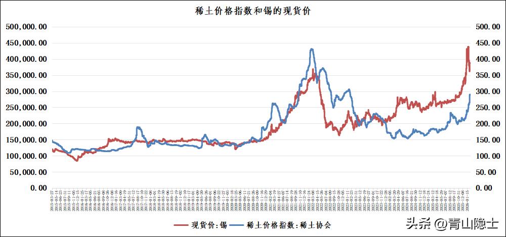 根据“锡现货价=稀土价格指数×1000”的统计学规律,结合2026年2月12日最新数据测算,当日稀土协会价格指数为290.2点,对应理论锡现货价应为290200元/吨,而实际锡现货价达392637.5元/吨,稀土价格指数较理论水平低估约35.3%;从1月下旬至2月中旬的整体走势来看,稀土指数虽持续上行,但修复节奏始终慢于锡价所映射的合理水平,低估状态持续凸显。