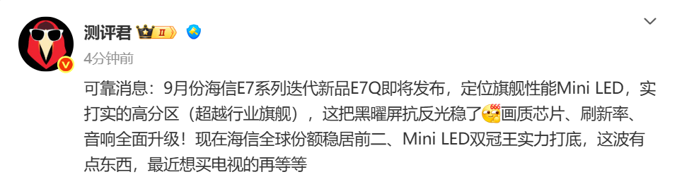 而就在这个节点,海信带着它的年度重磅新品——E7Q,强势归来。这款被数码科技大V测评君提前剧透、被业内称为“今年高端Mini LED电视天花板”的产品,正以“旗舰杀手”的姿态,准备背刺整个行业。