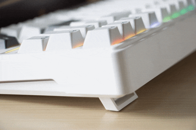 RKR87Pro AI键盘底部除了普通高度的硅胶防滑垫,还附加了一个2阶支架,可以让使用者在三个高度范围内调整键盘的仰角,以满足自己的习惯。