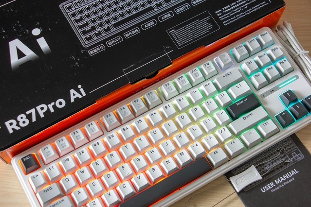 RKR87Pro AI键盘外包装硕大的AI喻示该键盘不是传统意义的普通键盘。除了说明书,随机还附赠了一个拔轴器和键盘数据线。