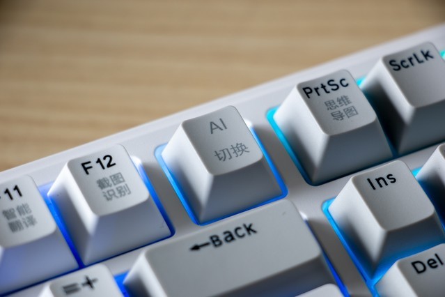 与常规机械键盘不同,RKR87Pro AI键盘最令人心动的就是其AI结合部分,F12旁边设计有AI功能键,一键AI直连,彰显了这款键盘的与众不同(AI按键激活需要配合驱动)。