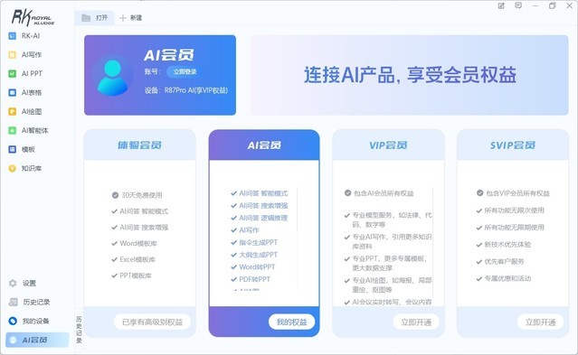 RKR87Pro AI键盘分为空青旗舰版能以及宇宙基础版,前者享受VIP会员权益,更专业更智能,而基础版享受AI会员权益,无门槛也能体验AI各种功能。