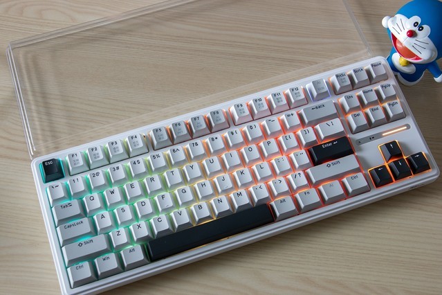 RKR87ProAI键盘是一款88键的客制化的机械键盘,虽然没有数字小键盘区,但是比起普通mini键盘依然保留了方向键以及插入翻页等独立功能键区,全键无冲,满足绝大多数人的使用要求,同时还很贴心的附赠了键盘防尘罩,以保证键盘干净整洁。