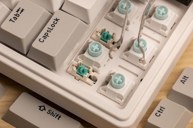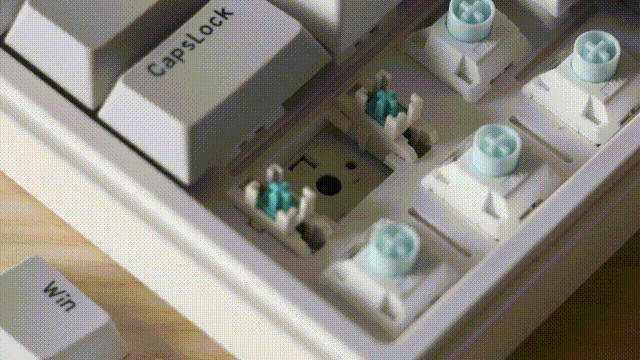 由于轴体底部有定位梢,因此不用担心插反或者位置偏导致轴体引脚受损,轴体拆装过程都很流畅,不用担心会损坏键盘。