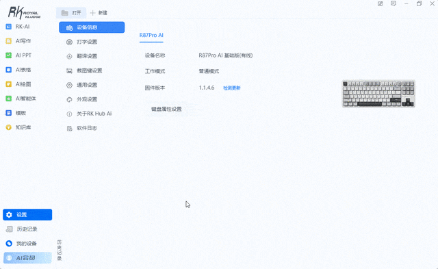 RKR87ProAI键盘的AI功能需要结合其强大的驱动共同完成的。装上驱动后,立刻识别其到相应的键盘。设置层面,主要是需要根据使用者习惯设定相应的语种。尤其令人心动的是,透过这把键盘,可以深度体验当下国内顶级AI大模型-Deepseek-R1,而无需额外付费。