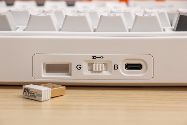 接入层面,RKR87ProAI键盘主打四模接入,除了提供了2.4G,有线以及蓝牙常规的三种接入模式,同时键盘区还有一键AI直通键,可以根据需要自行选择。键盘左侧顶部有个专用2.4G适配器磁吸收纳仓,用于收纳2.4G适配器。
