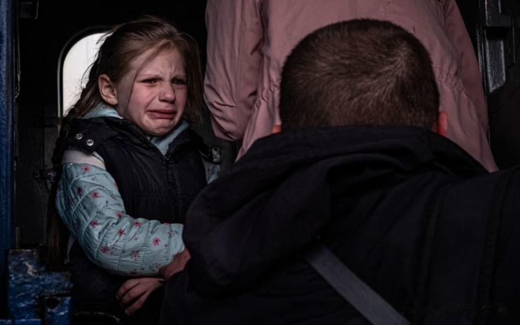 在乌克兰的哈尔科夫,一个女孩在与兄弟和母亲一起登上一辆特殊疏散火车时,哭着告别父亲。