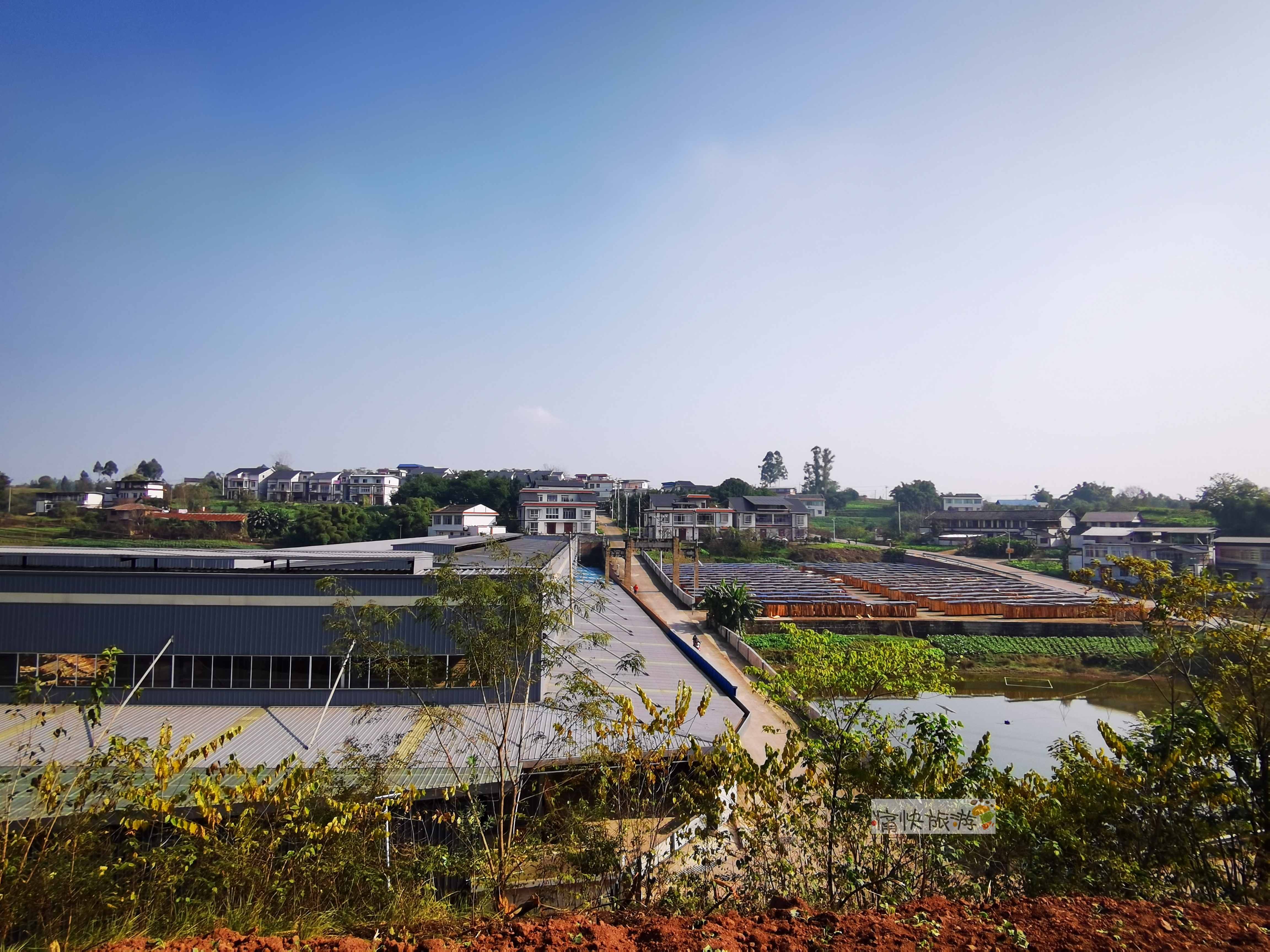 站在山坡隔路远眺对面的新农村小区,右侧还有一片层板的集中晾晒区。
