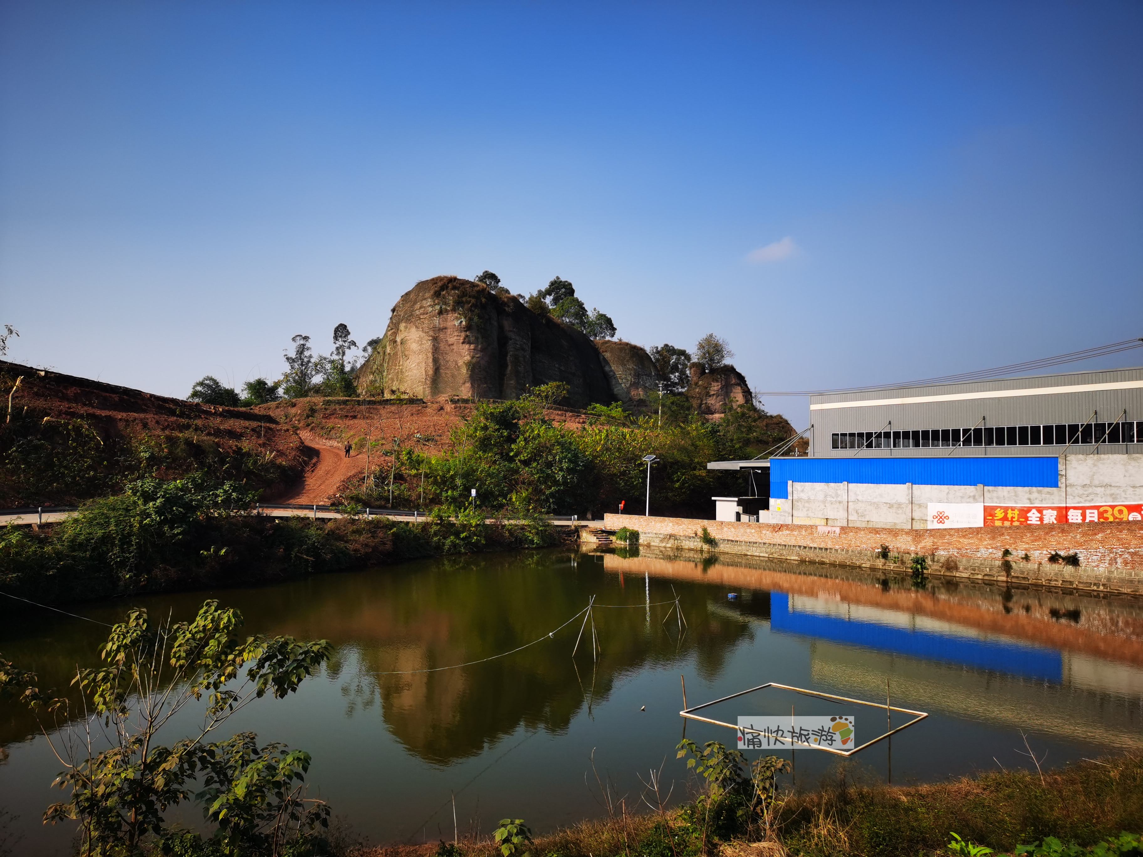 与厂房尽头毗邻的石头山,山体形状独特且陡峭,有点像丹霞地区的山体。