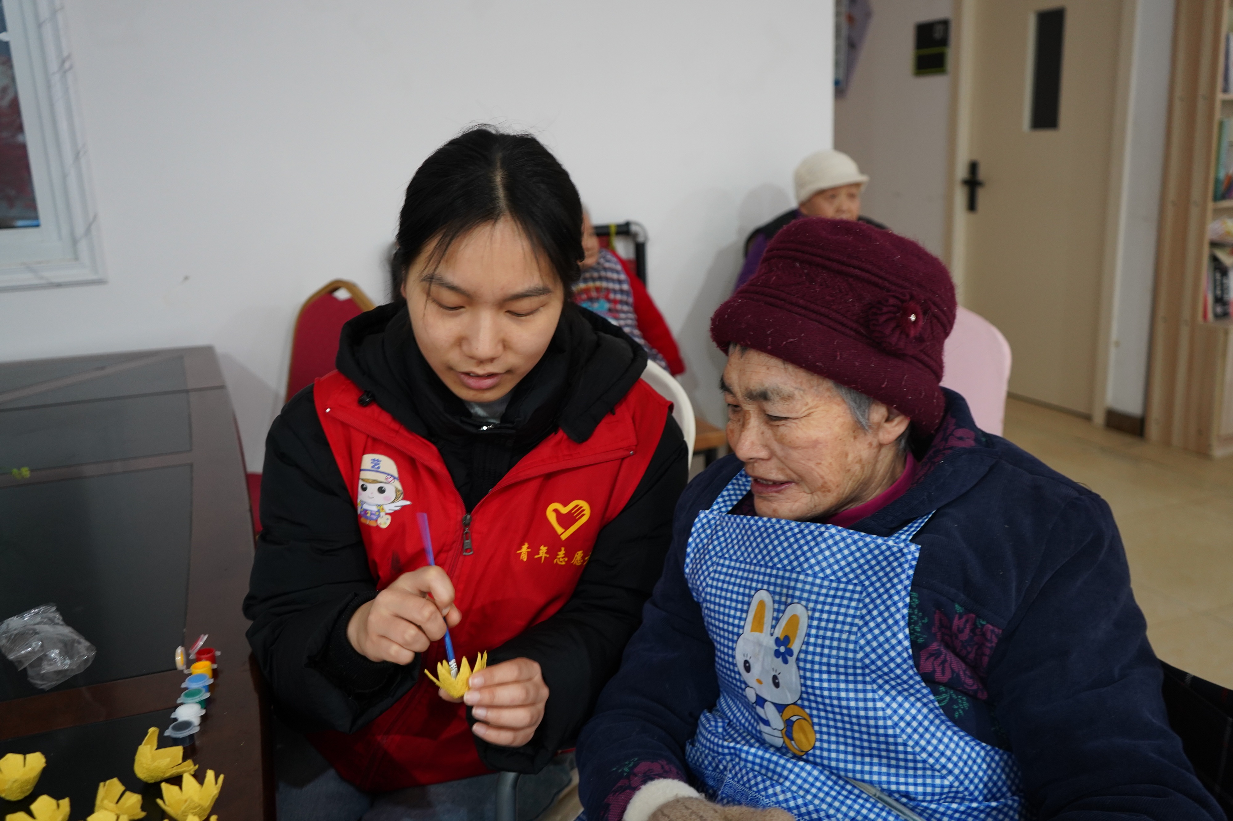 巧手创作展风采,暖心陪伴传真情。志愿者们一对一陪伴老人,利用蛋托、扭扭棒等环保材料,共同制作创意花束。老人们兴致勃勃地挑选颜色、搭配造型,在志愿者的协助下,将废旧材料变成一件件充满创意的手工作品。制作过程中,志愿者们耐心倾听老人的讲述,亲切交流,现场笑声不断,温情流淌。本次活动不仅锻炼了老人的手部精细动作,更在互动中增强了她们的情感联结与自我价值感。