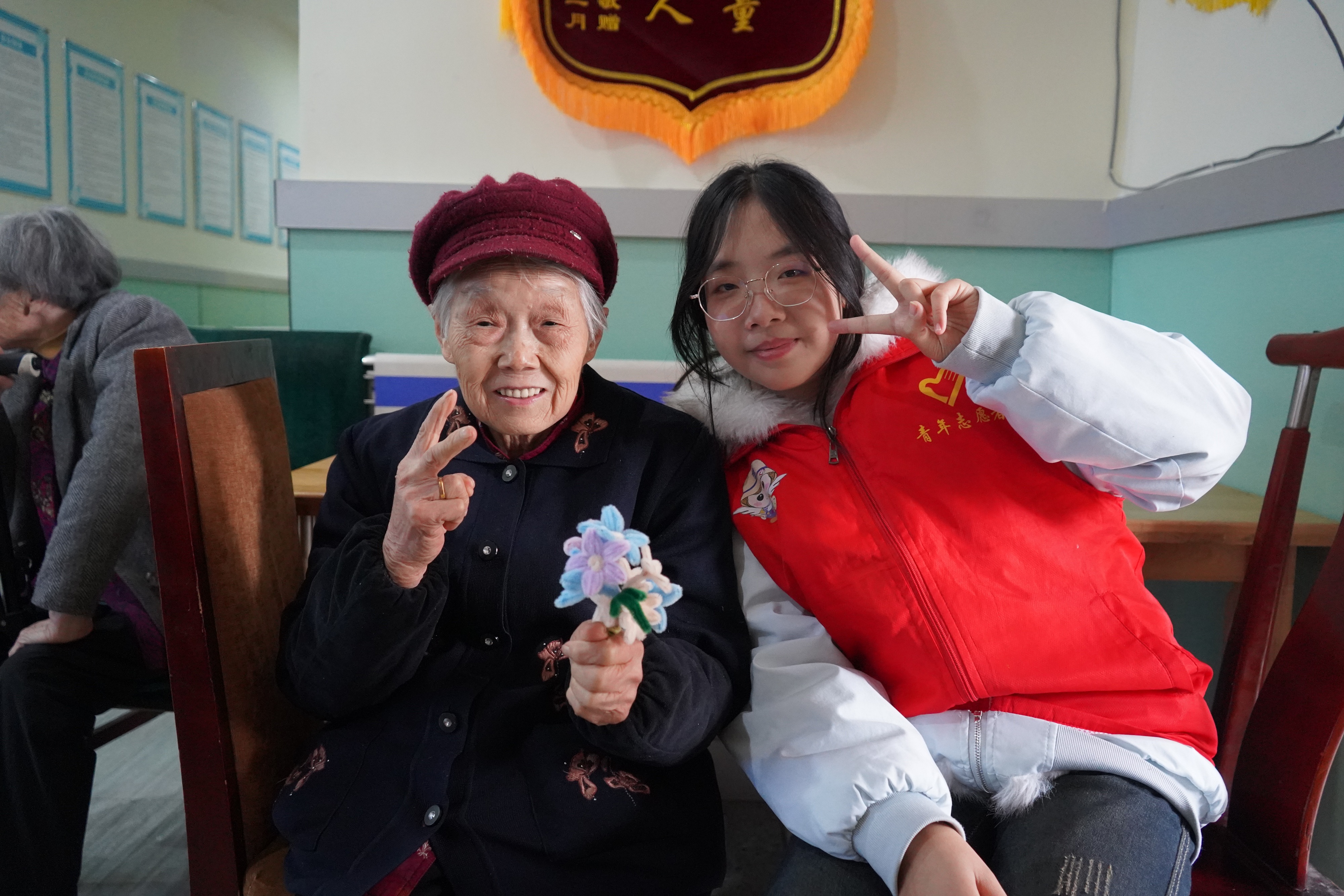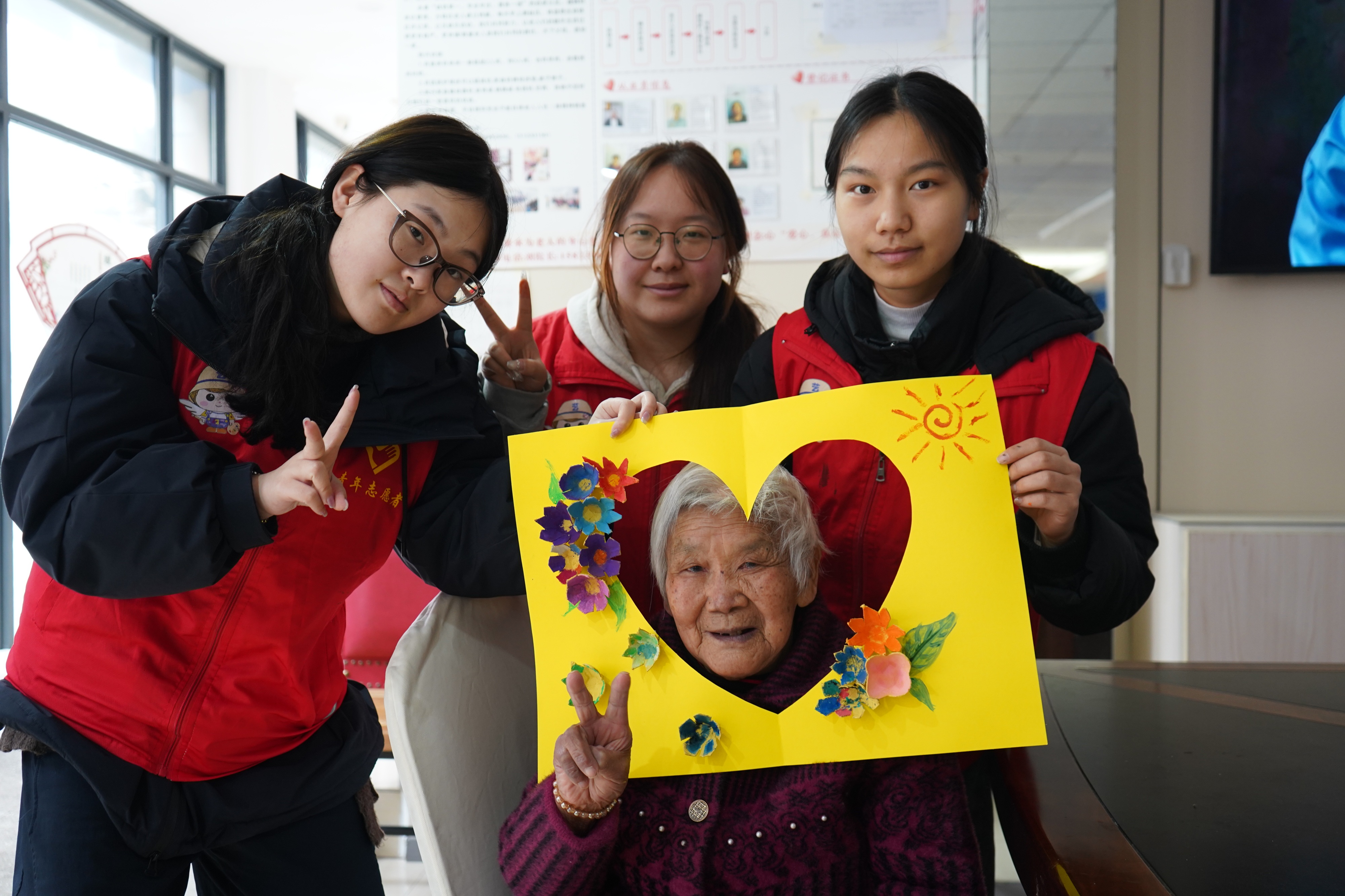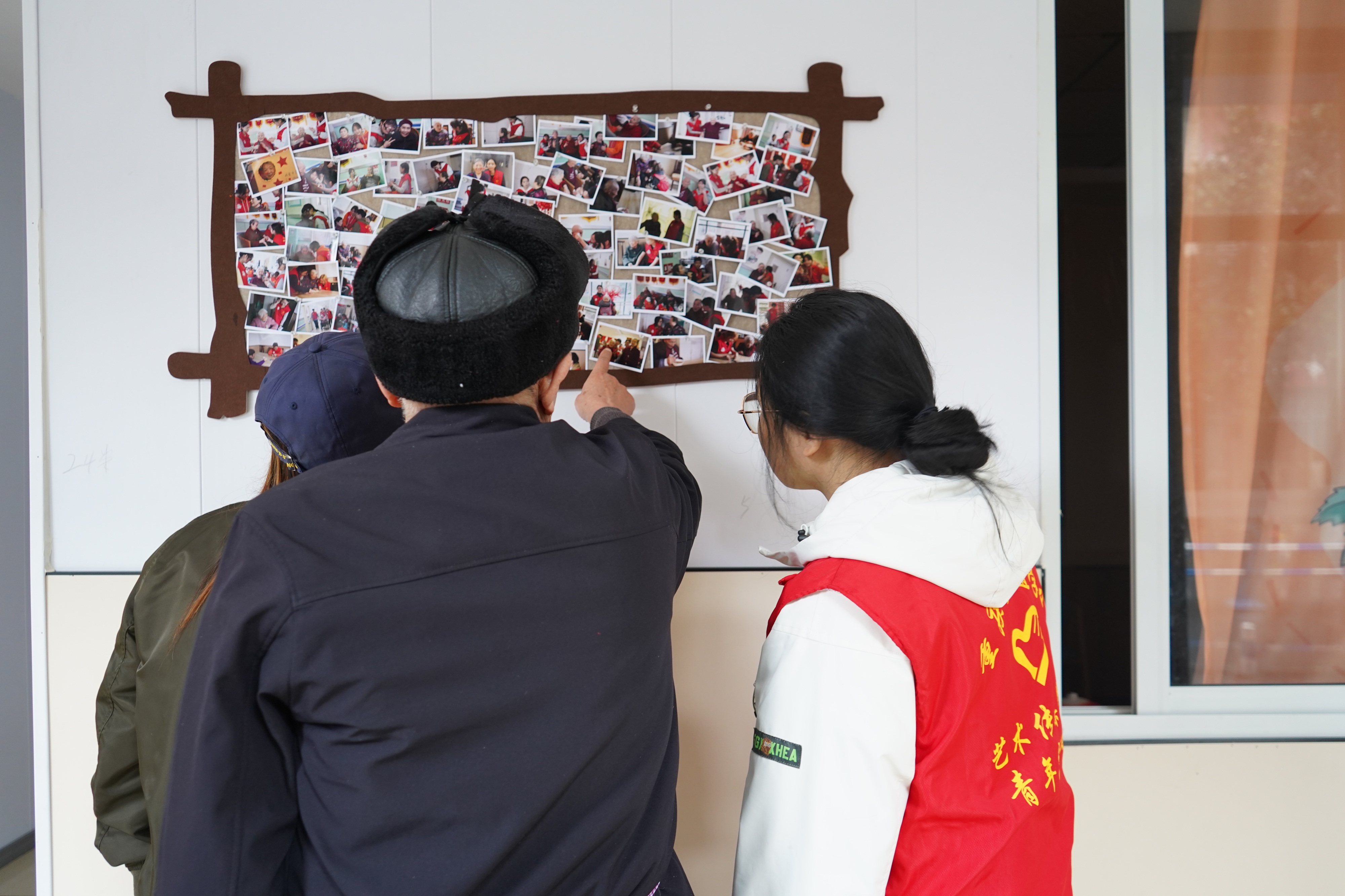 旧影重温往日情,新镜定格此时美。手工制作结束后,志愿者们将往期活动照片一一展示在照片墙上。一张张笑脸定格了志愿者与老人共度的温暖时光,老人望着照片墙,向志愿者娓娓讲述那些美好回忆。随后,志愿者们为老人拍摄创意照,用镜头记录下他们活动中的灿烂笑容。老人们端详着照片中的自己,脸上满是幸福与自豪。