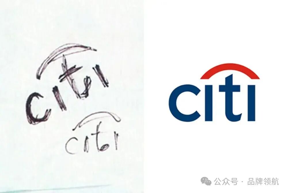 1998 年花旗集团与旅行者集团合并,要求设计师宝拉・谢尔在三周内完成新 logo 设计 —— 这个看似不可能的任务,最终以谢尔在餐巾纸上的草图落地。但鲜有人知的是,这张 “潦草 scribble”(谢尔自嘲为 “愚蠢的涂鸦”)背后,是她对两大品牌基因的精准拆解:保留花旗银行的 “CITI” 字母核心,延续旅行者集团的红色雨伞符号,用蓝色与红色的碰撞呼应合并后的品牌融合。