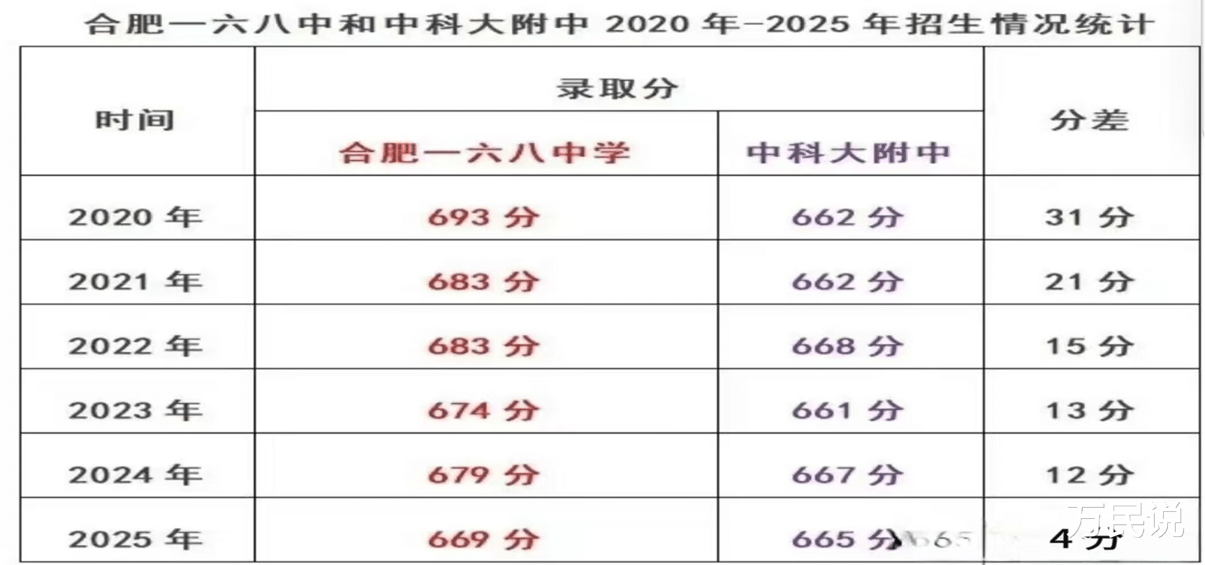 一组数据很说明问题:从2020年到2025年,中科大附中与合肥一六八中学的录取分差,从31分一路追到21分、15分、13分、12分,再到2025年——只剩4分。