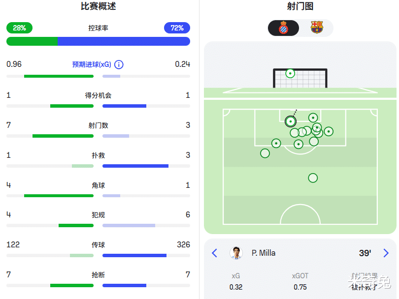 从上半场统计数据看,西班牙人的预期进球高达0.96,巴萨仅有0.24。西班牙人没能收获进球,完全是因为乔安加西亚的神扑。
