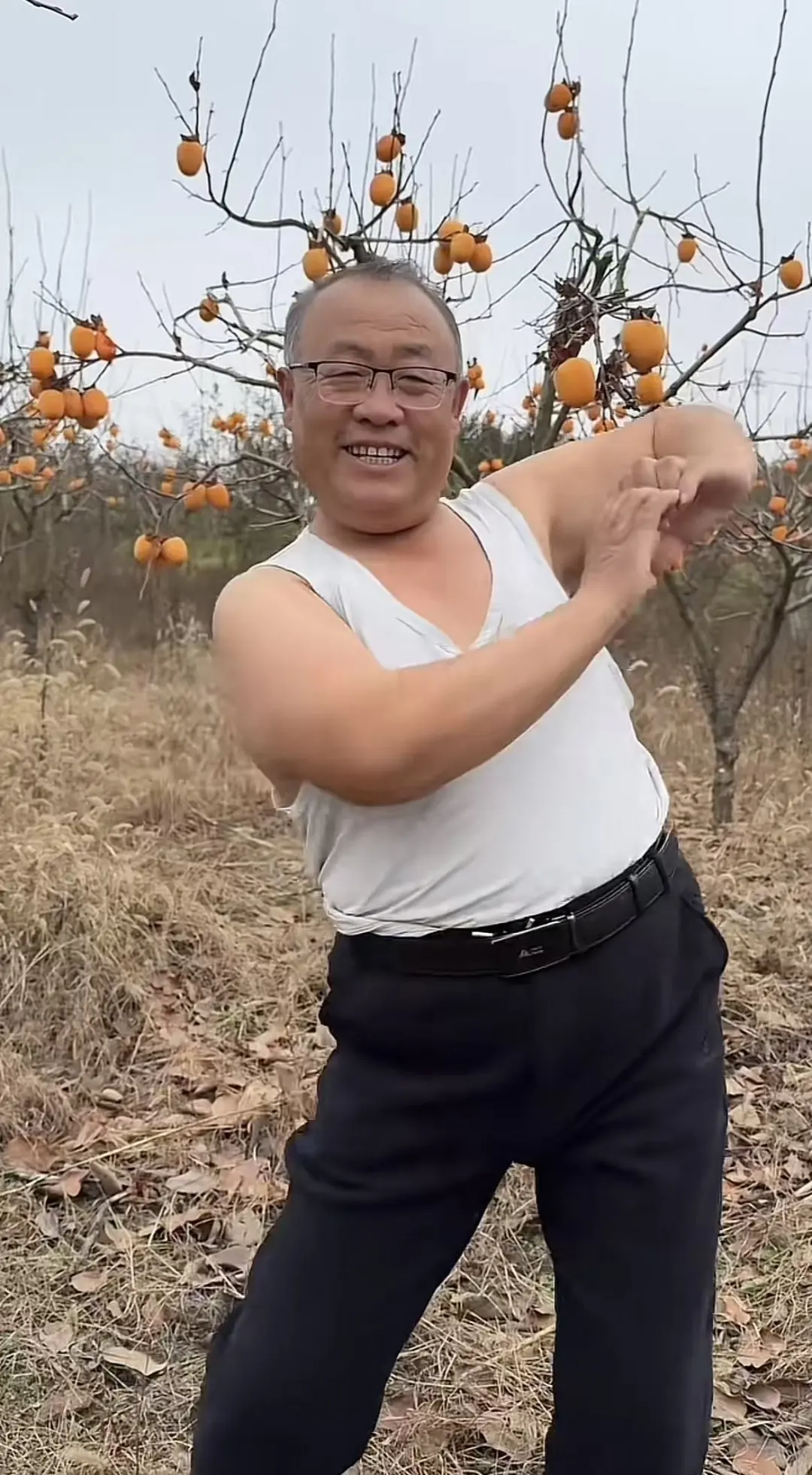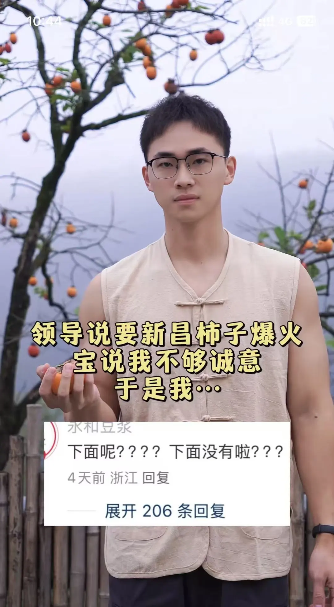 视频发布后收效甚微,为了更好地帮助村民们把柿子卖出去,他也是“听劝地豁出去了”,于是视频变成了这个样子: