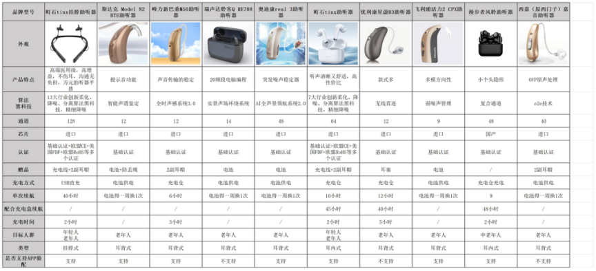 下面是几款助听器的详细数据
