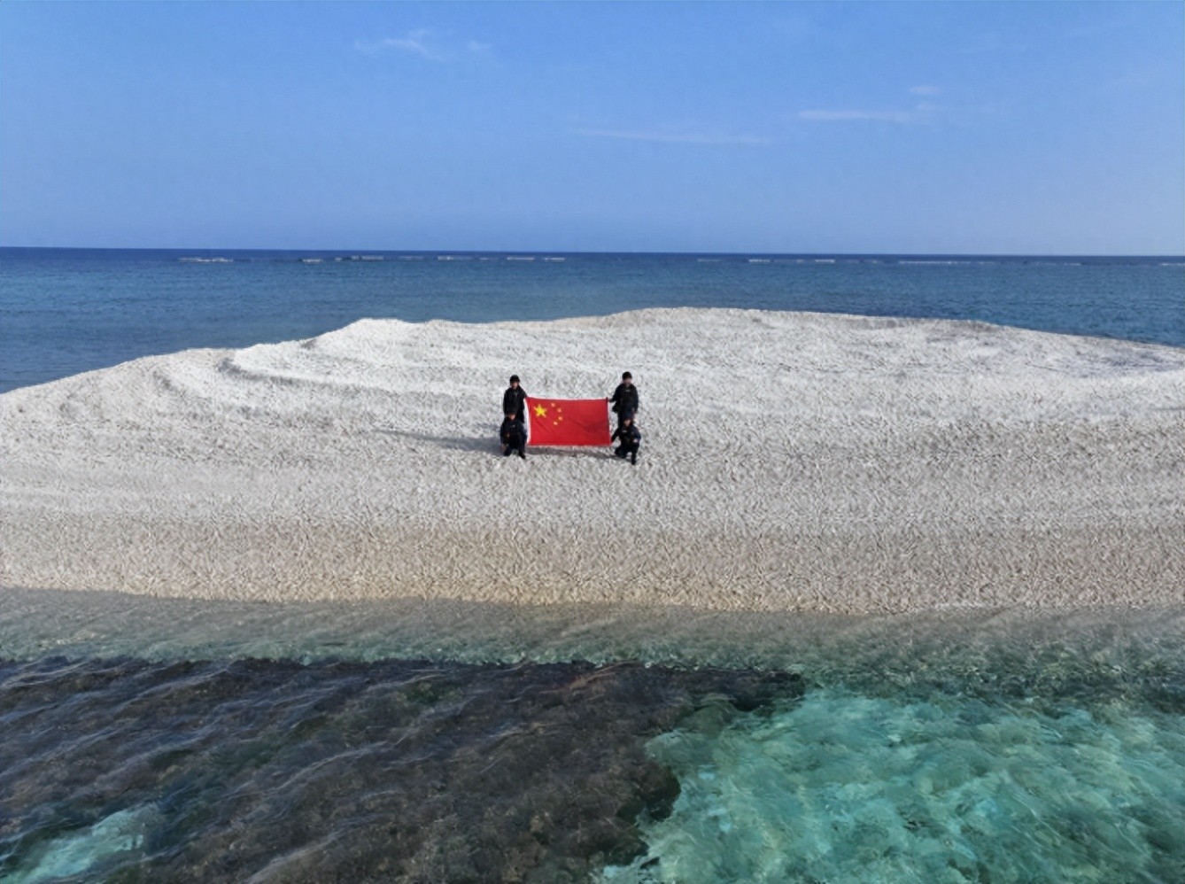 就在冲突后中国海警执法员登上铁线礁,一面展开五星红旗宣示主权一面清理礁上塑料木棍等垃圾。
