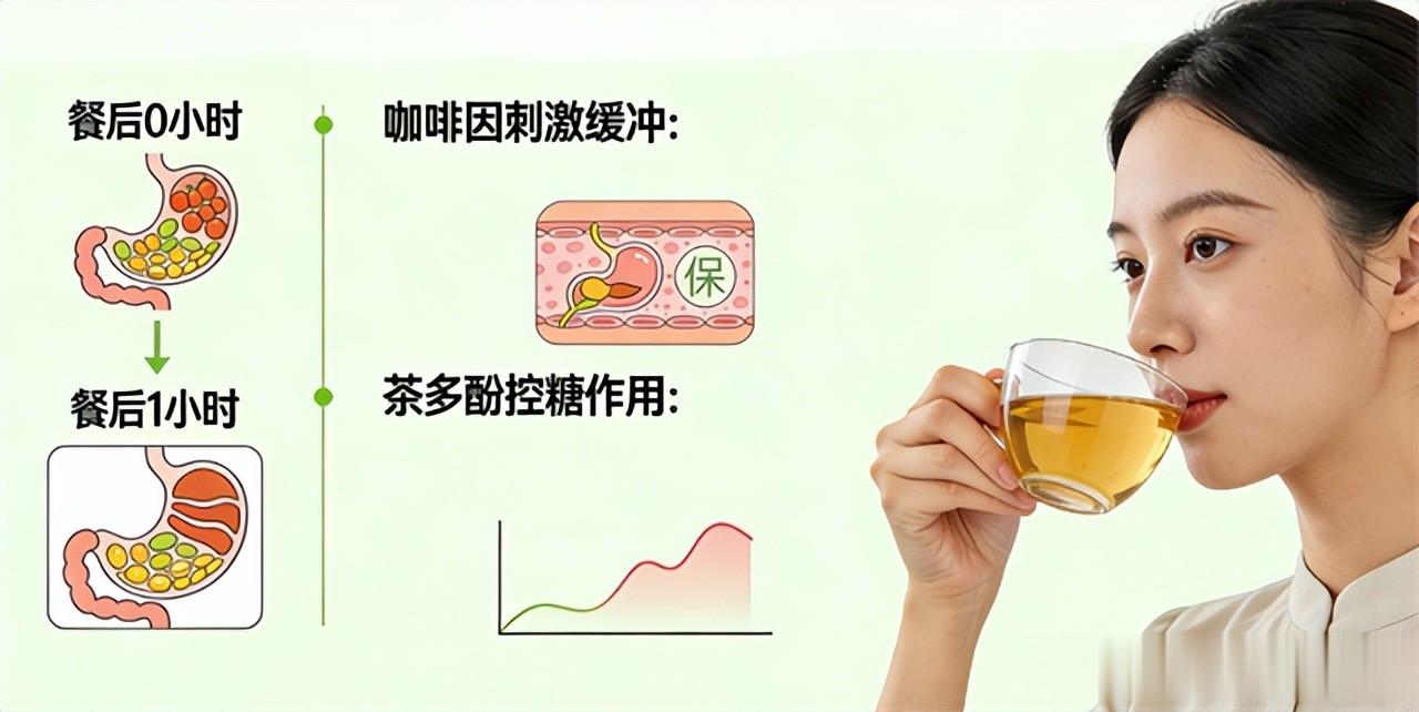 餐后1小时喝一杯淡茶(如淡绿茶/淡红茶)更有意义,此时胃里已有食物,咖啡因对胃黏膜的刺激会被食物缓冲,而茶多酚等活性成分可以辅助延缓碳水化合物的吸收曲线,有助于控制餐后血糖高峰。