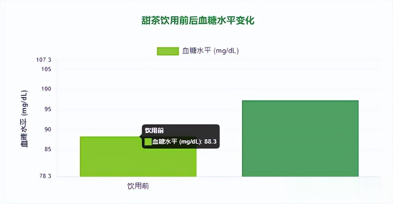 结果显示,饮用甜茶后平均血糖从88.3 mg/dL上升到97.3 mg/dL(约4.9 mmol/L升至5.4 mmol/L),平均增加了约8.3 mg/dL(约0.46 mmol/L),且统计分析(配对样本t检验)表明这一升高在统计学上具有显著意义(p < 0.05)。这一明显的升高说明,即使是一次常见的甜茶摄入也会使血糖明显上扬,反映了可溶性糖(添加糖)对血糖的直接影响。