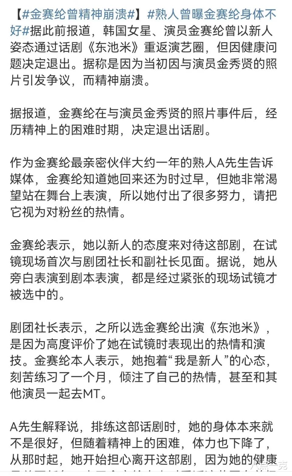 金赛纶醉酒逃逸后,事业一度进入停滞期,为了重回巅峰时期,金赛纶还曾以新人的姿态通过出演话剧重返演艺圈。后来因为与金秀贤贴脸照片的事情引发了巨大的网络热议,也受到了很多网友的攻击和谩骂,导致精神重度崩溃,最终决定退出话剧。