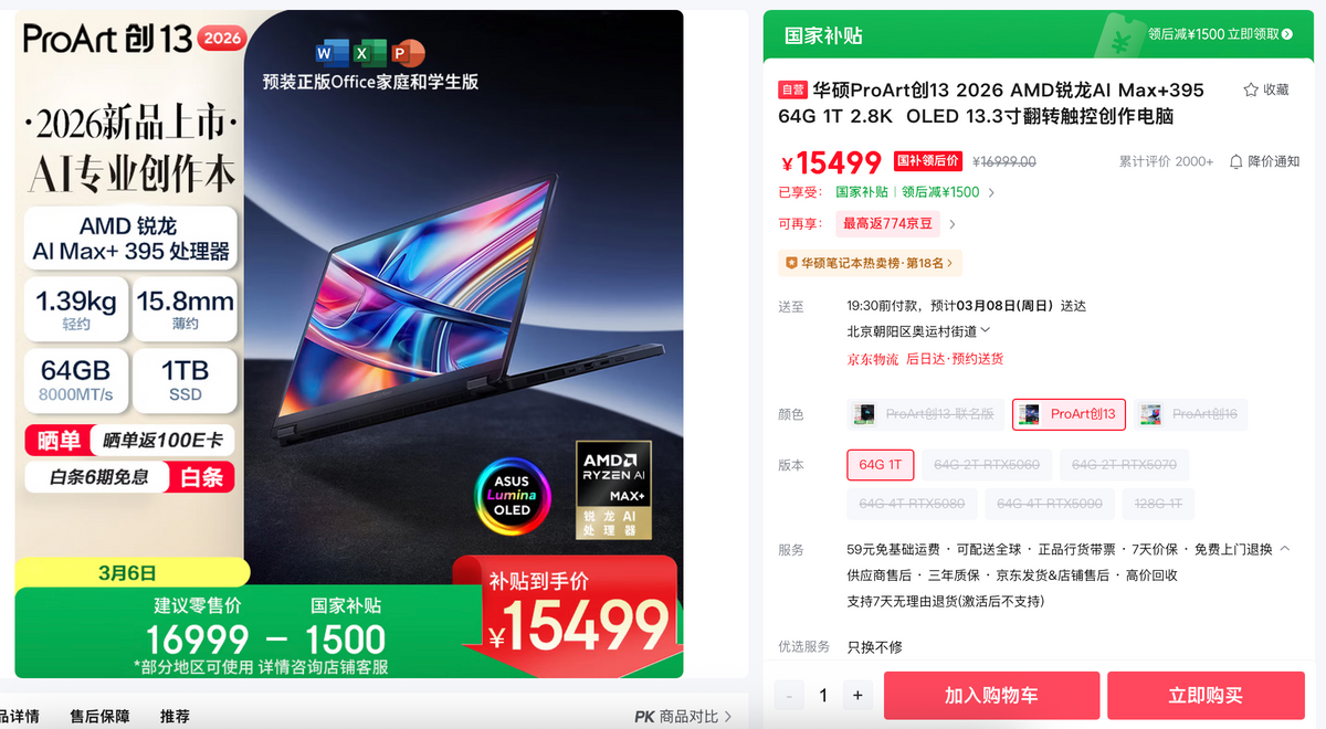 上京东搜索#华硕ProArt 创13 2026#即可了解更多产品细节。当前购机部分地区可享至高15%国家补贴,到手价13499元,还能免费领取6个月剪映会员,解锁更多高级创作功能,选购价值拉满(活动详情可咨询京东客服)。想要升级创作装备,让灵感高效落地的朋友,这款“轻便又能打”的AI专业创作本值得闭眼冲!