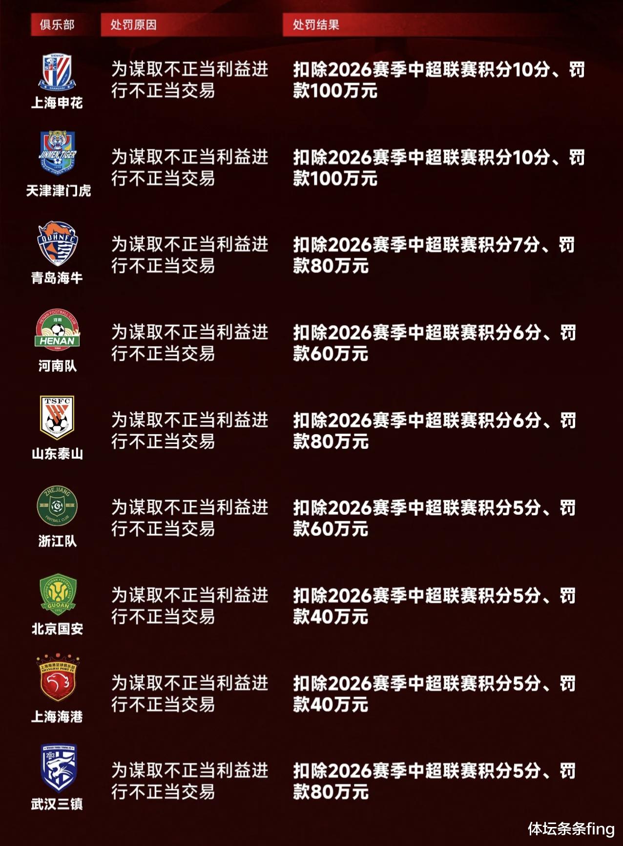 就这一次处罚而言,最严厉的处罚,天津津门虎和上海申花也仅仅只扣除10分罢了。相比上一次至少也有四川队和广州队的降级处罚,这一次算是大家都罚酒三杯轻轻的放下了。不少球队都是不只一次两次涉“假赌黑”了,就这样隔靴搔痒的处罚真不知道是好事还是坏事?