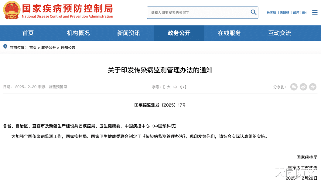 近期,国家疾病预防控制局网站发布国家疾控局、国家卫生健康委《关于印发传染病监测管理办法的通知》,