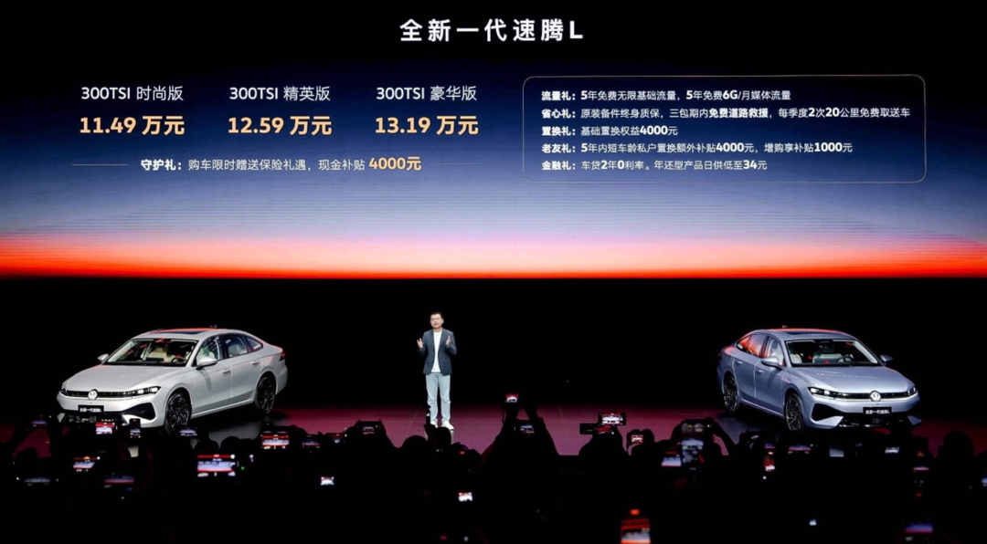 9月9日一汽-大众全新一代速腾L上市,推出300TSI时尚版、精英版、豪华版三款配置,官方指导价分别为11.49万元、12.59万元和13.19万元。