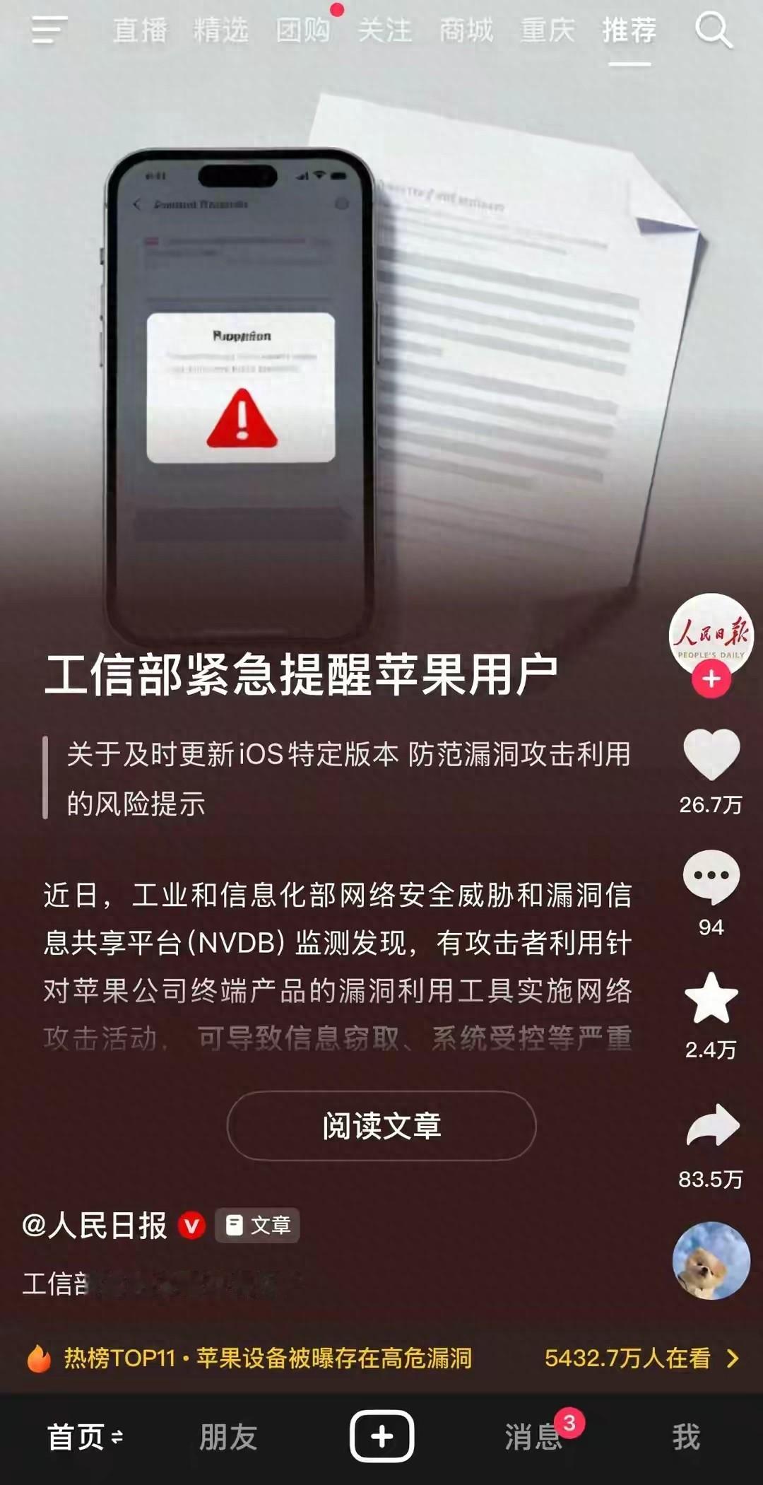 说实话,我一开始看到工信部那个通报,后背都发凉了。这次真不是吓唬人,也不是什么“狼来了”。是工信部网络安全威胁和漏洞信息共享平台,白纸黑字发的紧急预警。简单说就是:用苹果手机和平板的朋友,如果你的系统版本没对,你现在可能正被黑客“现场直播”,而你却浑然不知。