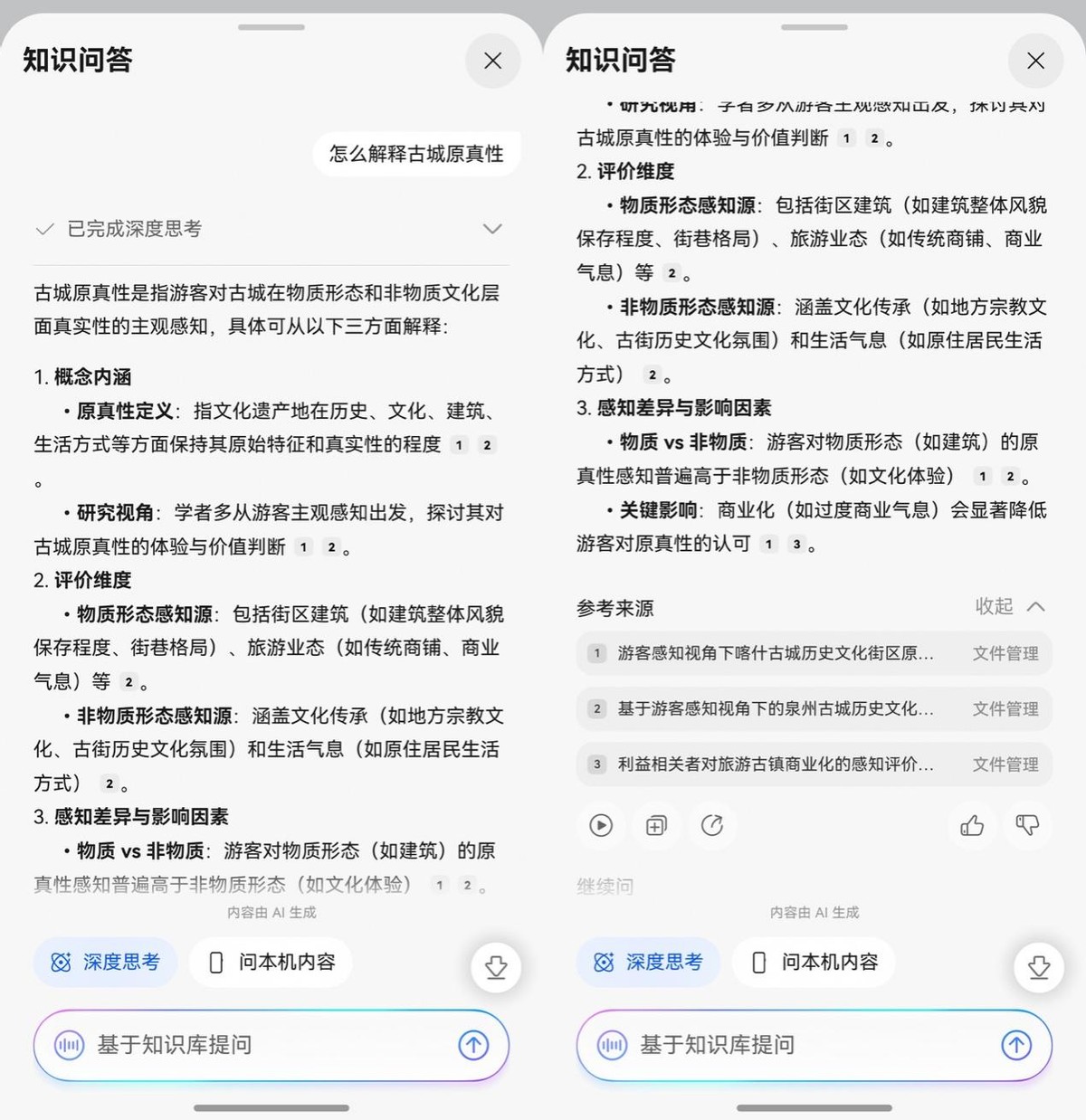 最近我还计划写个关于文化遗产的稿子,要求比较高,卡壳儿的时候立刻就想到了小艺知识库!我惊喜的发现,我通过小艺知识库收藏的各个App里的参考内容都被TA整理好了,寻找想要的资料太方便了!还能基于我在知识库积累的内容给我需要的答案,比方说我问小艺:怎么通俗解释古城原真性?TA经过深度思考立刻给出精准的解读,帮我写稿子省了不少时间。