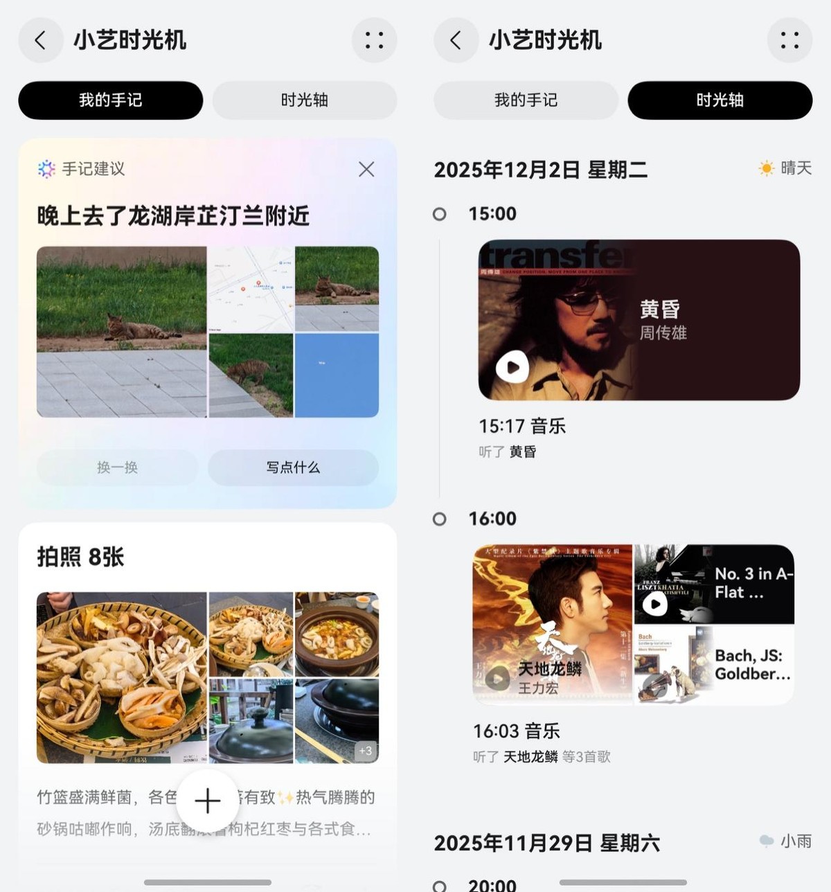 大佬们都爱用的小艺时光机我先替大家试了,真的是“万物皆可游记”,我去附近遛弯、和朋友一起吃饭,TA都有帮我记录,我听过的歌也都一起生成了时光轴,感觉我立刻就可以“编辑”我的生活了!就像“学术酒吧”里甜草莓老师说的一样,“小艺时光机在做一件让我们感动的事”,快和我一起让这些珍贵的回忆再次发光吧!