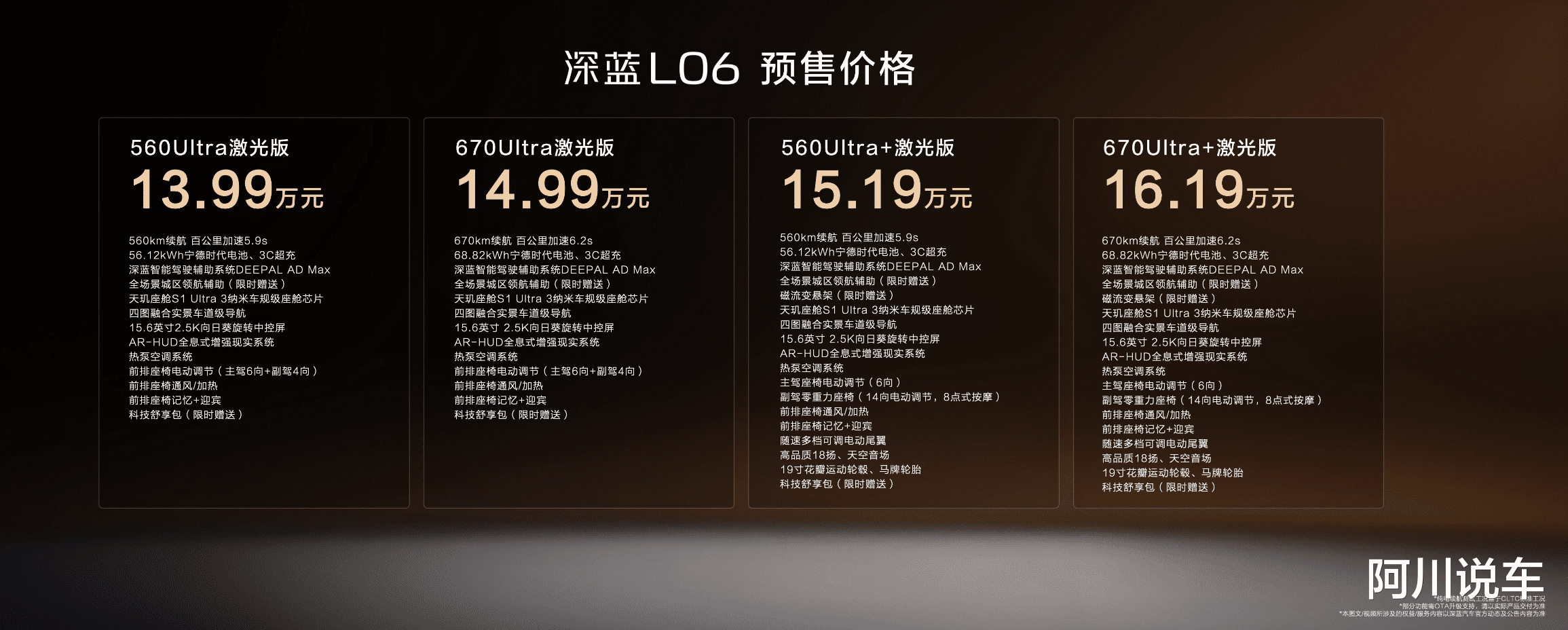 深蓝L06已正式开启预售。新车共推出四款配置车型:560Ultra激光版预售价13.99万元、670Ultra激光版预售价14.99万元、560Ultra+激光版预售价15.19万元、670Ultra+激光版预售价16.19万元,预售权益至高可享价值80259元。