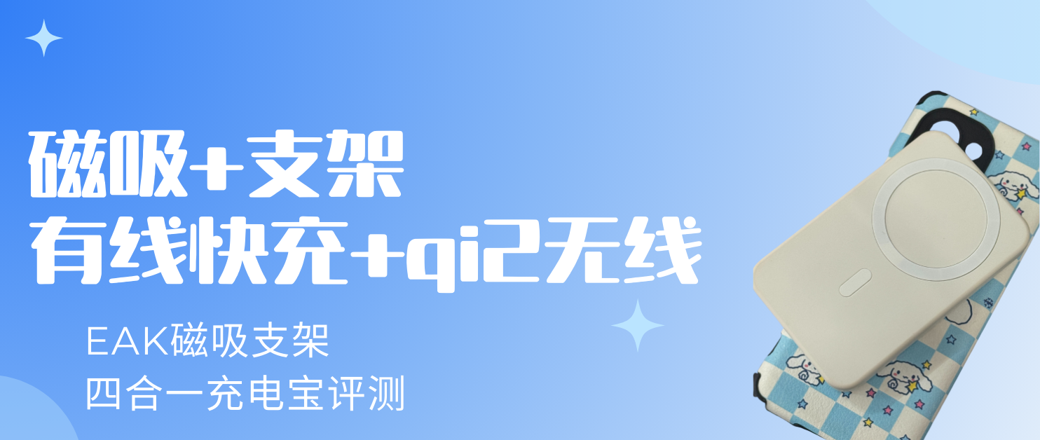 作为以“实用创新、高性价比”为核心定位的3C数码充电品牌,EAK深耕便携充电领域多年,聚焦用户日常续航痛点,推出多款适配多场景、兼顾性能与便捷性的充电产品,凭借扎实的品质与亲民的定价,收获了广大消费者的认可。近期,我们有幸拿到了EAK旗下磁吸支架充电宝,这款产品区别于传统充电宝,以“磁吸+支架+有线(自带线)+无线(qi2认证)”四合一为核心亮点,融合qi2无线快充、自带线便捷快充、轻薄便携、全面安全防护等优势,致力于解决用户多设备充电、手持观影不便、忘带充电线等痛点。无论是日常通勤、办公室办公,还是短途旅行、居家休闲,都能提供全方位、更便捷的续航支持。本次评测将从开箱、外观、磁吸、协议、性能、场景等多维度展开,详细拆解这款产品的每一处细节,看看它的实际表现究竟如何。