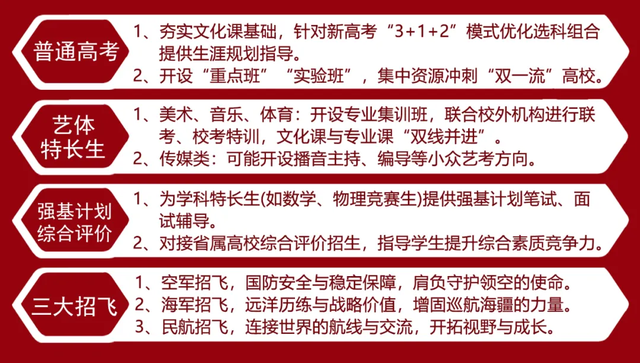 升学多元,出路宽广: 我们打破高考“独木桥”的局限,为不同特点的学生量身定制升学路径。普通高考、强基计划、艺体特长、三大专项、三大招飞、国际升学等多元通道,真正将升学路变成“立交桥”,助力每个孩子升入理想学府,让家长对孩子的未来充满信心。