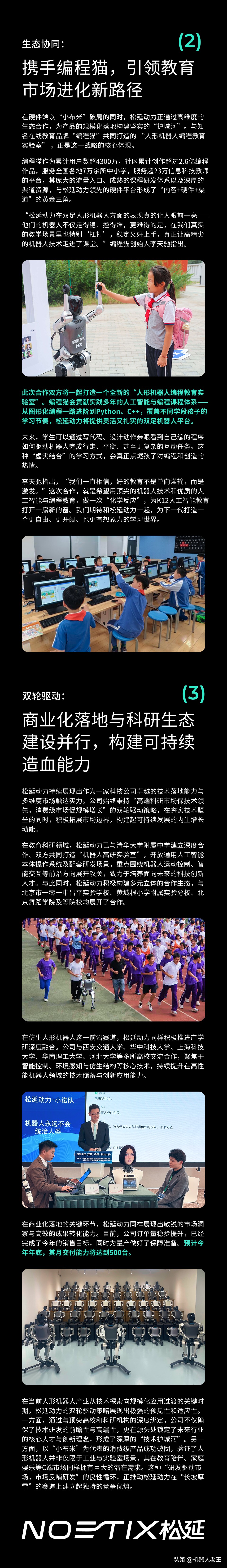 商业化合作方面,松延动力在本轮融资发布的同时,宣布与编程教育龙头编程猫达成战略合作,双方将联合打造 “人形机器人编程教育实验室”,松延动力的机器人产品将与编程猫的课程体系、渠道网络深度融合。此外,公司还与清华大学附属中学共建 “机器人高研实验室”,并与西安交通大学、华中科技大学等多所高校展开技术合作,聚焦智能控制、仿生结构等核心技术研发。