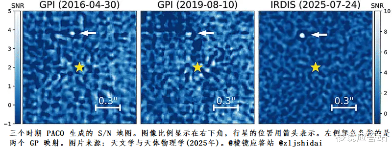 西北大学研究生娜塔莉·琼斯,去年夏天,重新梳理双子座南望远镜GeminiPlanetImager(GPI)的十年旧档。在2016至2019年图像中,一个微弱点,随HD143811AB双星移动,角距仅430毫角秒。