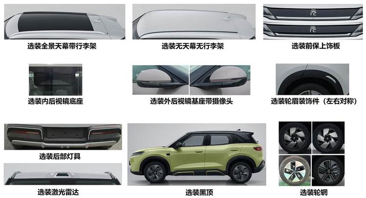 根据申报信息,新款元UP在配置上提供了丰富的选装项,其中最为引人注目的是车顶激光雷达。这意味着高阶智能驾驶辅助系统很可能将成为新款元UP的一个潜在卖点。此外,可选装的项目还包括全景天窗、不同样式的前后包围饰板、侧视及后视摄像头、双色车身以及多种款式的17英寸轮圈。这些选装配置让车辆在科技感和个性化方面有了更高的上限,能够满足不同用户的偏好需求。