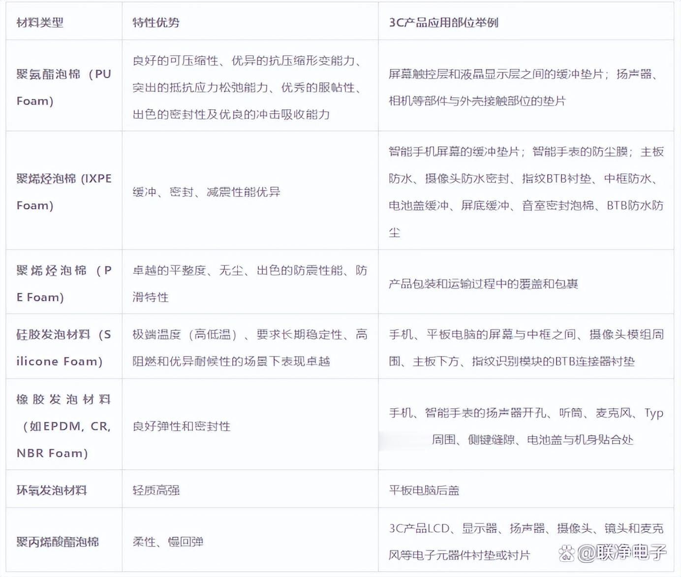 3C产品中常见的发泡材料主要有聚氨酯泡棉(PU Foam)、聚烯烃泡棉(如IXPE,PE Foam)、硅胶发泡材料(Silicone Foam)、橡胶发泡材料(如EPDM,CR,NBR Foam)、环氧发泡材料、聚丙烯酸酯泡棉等。它们因其特性被用于不同部位这些发泡材料广泛应用于手机、平板电脑、笔记本电脑、智能手表等3C产品的多个关键部位,实现缓冲、密封、防水、防尘、隔热、吸音等功能。