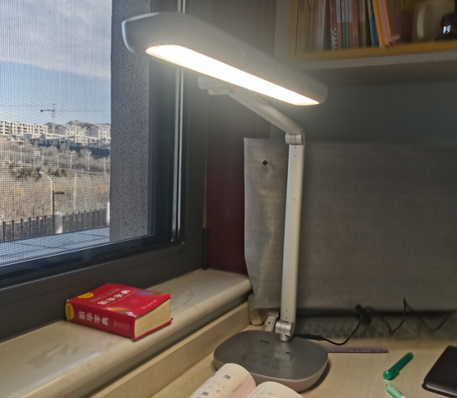 飞利浦A5开灯之后,亮度是够用的,但整个桌面铺得不是特别均匀,边缘会暗一点。灯光偏白,直视灯板会有点刺眼。