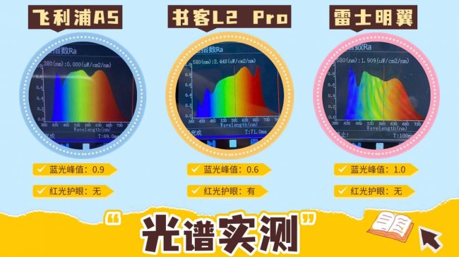 维度1:光谱结构在统一4000K色温条件下测试蓝光峰值与补全红光表现。三款数据分别为: