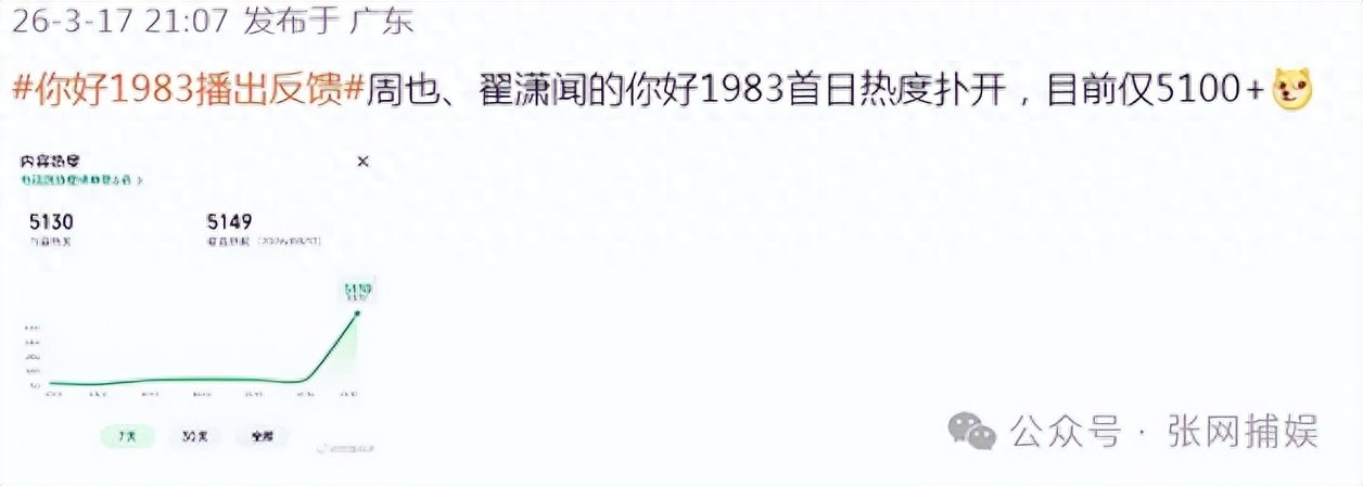 3月17日爱奇艺首播,《你好1983》开局堪称“灾难级”:官博预热频频手滑,把剧名打成你好1938,基础宣发失误不断;女主周也粉丝不满平台资源倾斜,直接发起“0包场”抵制,硬生生拖累初期热度;首播2小时站内热度堪堪4800,全天仅5100+,连6000的基础目标值都没摸到,妥妥的垫底预定。