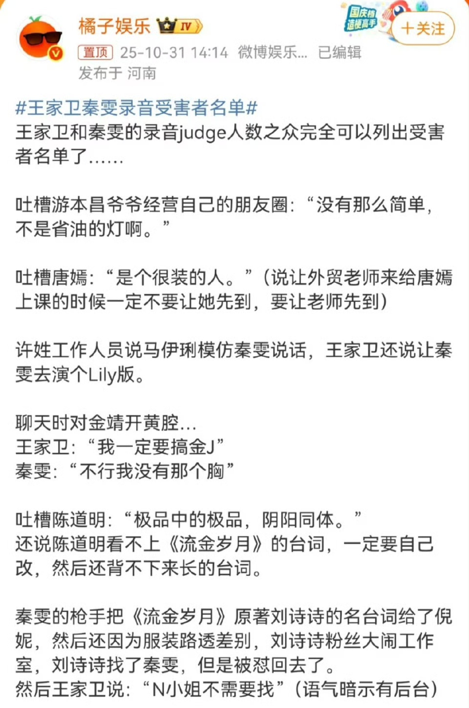 随着事件持续发酵,网友迅速整理出一份“王家卫录音受害者名单”,涉及演员之多、内容之辛辣,令人瞠目结舌。这场风波不仅撕开了娱乐圈的光鲜表面,更将行业长期存在的权力不平等问题暴露无遗。